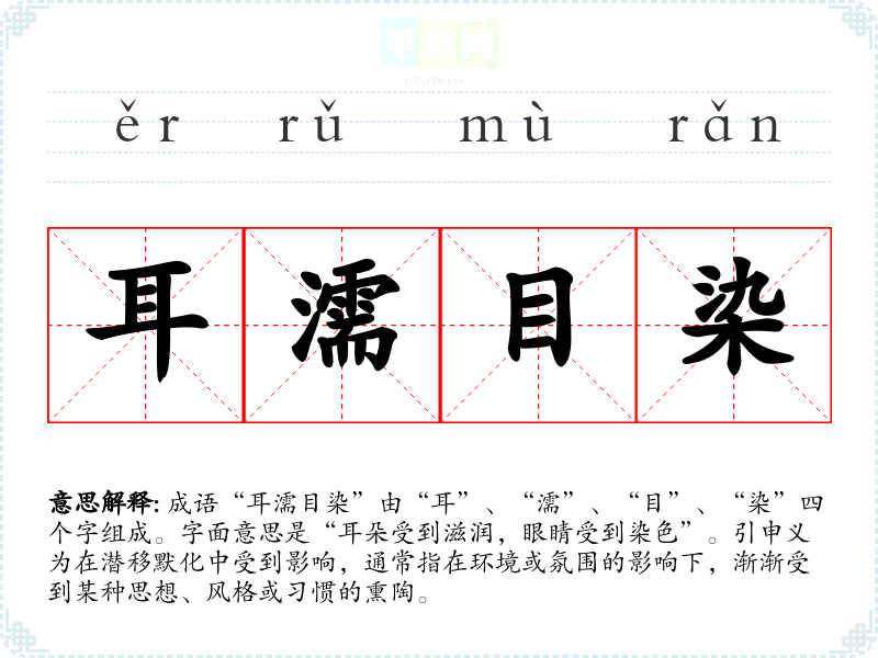 | 目濡耳染 | 濡:沾湿;染:沾染。耳朵经常听到,眼睛经常看到,不知不觉地受到影响。 |