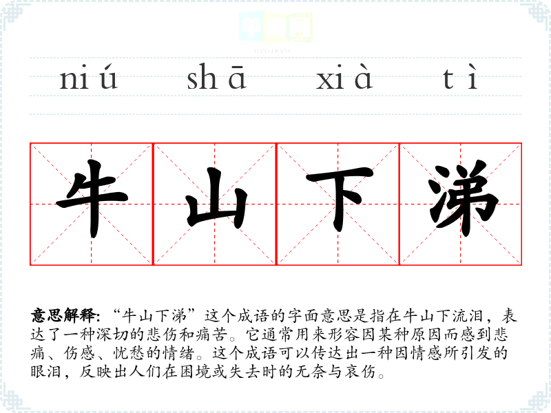 “牛山下涕”这个成语的字面意思是指在牛山下流泪,表达了一种深切的悲伤和痛苦。它通常用来形容因某种原因而感到悲痛、伤感、忧愁的情绪。这个成语可以传达出一种因情感所引发的眼泪,反映出人们在困境或失去时的无奈与哀伤。