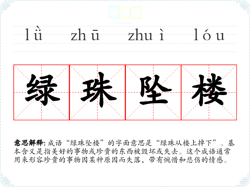 成语“绿珠坠楼”的字面意思是“绿珠从楼上掉下”。基本含义是指美好的事物或珍贵的东西被毁坏或失去。这个成语通常用来形容珍贵的事物因某种原因而失落,带有惋惜和悲伤的情感。