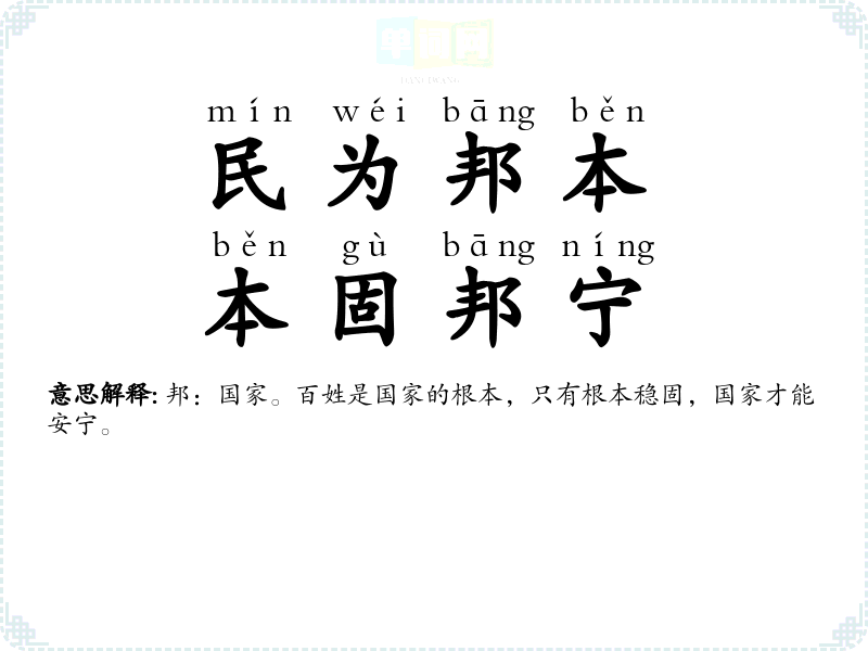 | 民为邦本,本固邦宁 | 邦:国家。百姓是国家的根本,只有根本稳固,国家才能安宁。 |