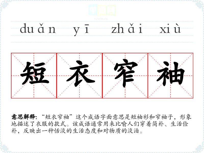 “短衣窄袖”这个成语字面意思是短袖衫和窄袖子,形象地描述了衣服的款式。该成语通常用来比喻人们穿着简朴、生活俭朴,反映出一种恬淡的生活态度和对物质的淡泊。