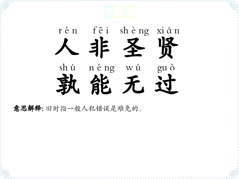 | 人非圣贤,孰能无过 | 旧时指一般人犯错误是难免的。 |