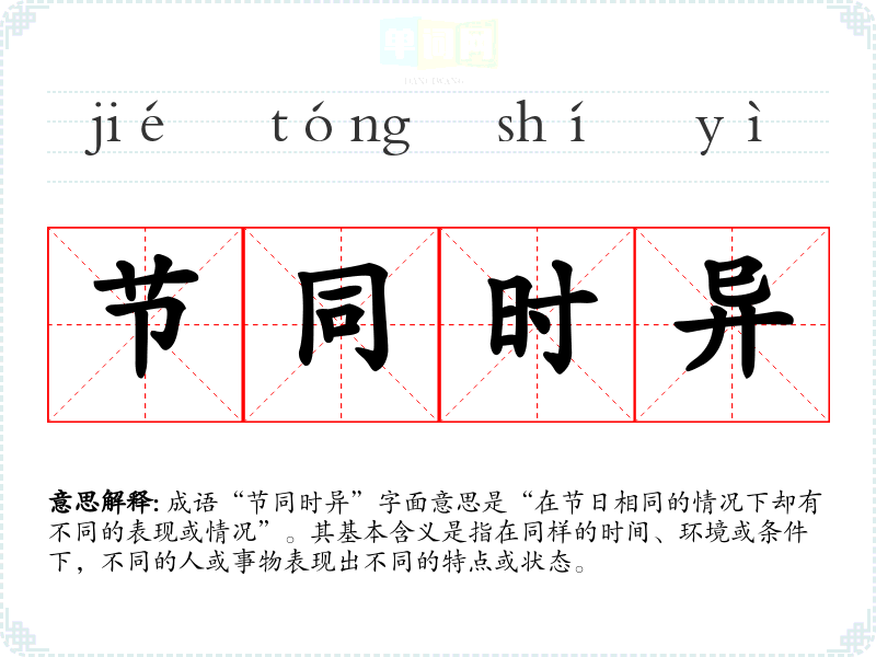 成语“节同时异”字面意思是“在节日相同的情况下却有不同的表现或情况”。其基本含义是指在同样的时间、环境或条件下,不同的人或事物表现出不同的特点或状态。