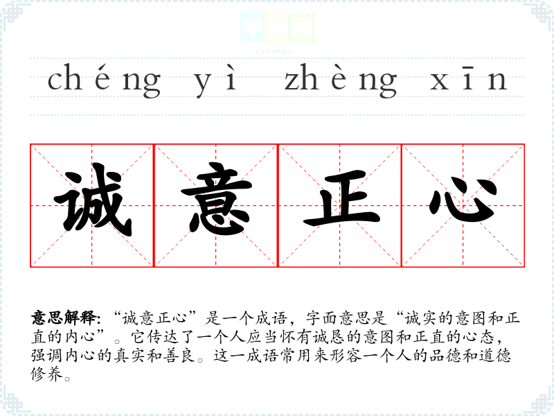 | 诚意正心 | 诚:真心实意;正:纠正。有真诚的心意才能端正心思。 |