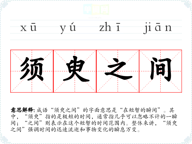 “须臾之间”在**传统文化中,常常用来反映对时间的哲学思考和对生命脆弱的感慨。在现代社会,随着快节奏生活的加快,这一成语变得更加贴切,提醒人们珍惜眼前的每一刻。