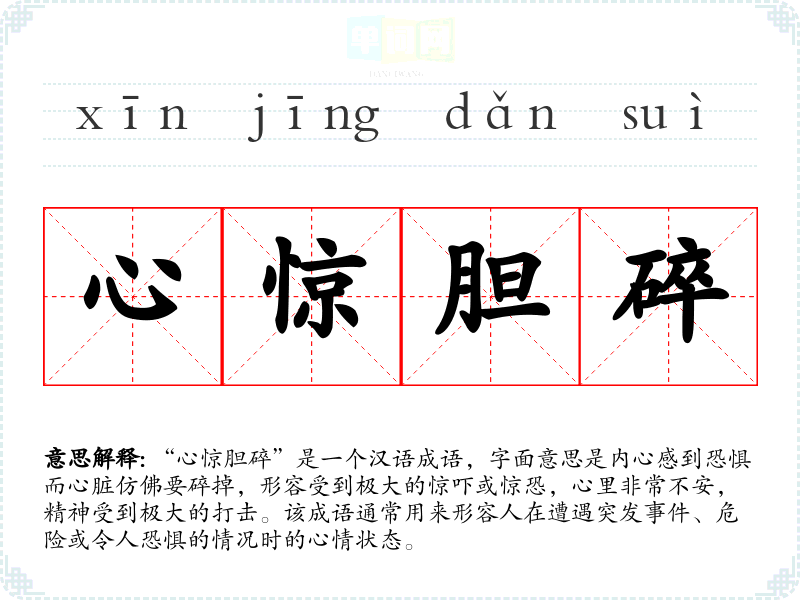 “心惊胆碎”最早见于《红楼梦》的某些版本中。成语的构成“心惊”指心里受到惊吓,“胆碎”则是形容胆子也因恐惧而几乎碎裂。这个成语的使用反映了古代人对于心理状态和身体反应的细腻描写,表达了人们在面对恐惧时的脆弱和无助。