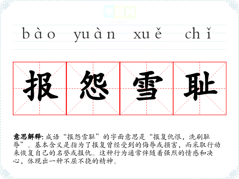 | 报怨雪耻 | 报:报复;雪:洗刷。报怨恨,洗刷耻辱。 |