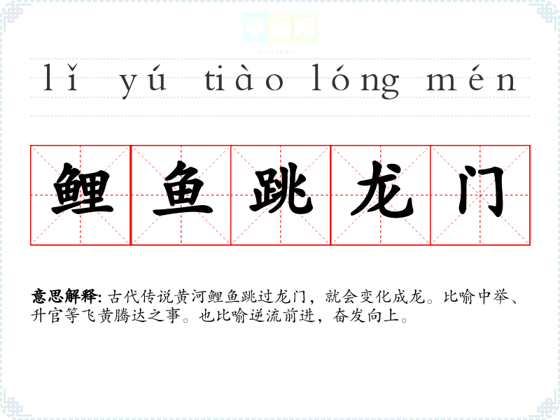 | 鲤鱼跳龙门 | 古代传说黄河鲤鱼跳过龙门,就会变化成龙。比喻中举、升官等飞黄腾达之事。也比喻逆流前进,奋发向上。 |