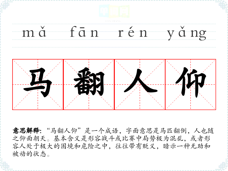 “马翻人仰”是一个成语,字面意思是马匹翻倒,人也随之仰面朝天。基本含义是形容战斗或比赛中局势极为混乱,或者形容人处于极大的困境和危险之中,往往带有贬义,暗示一种无助和被动的状态。