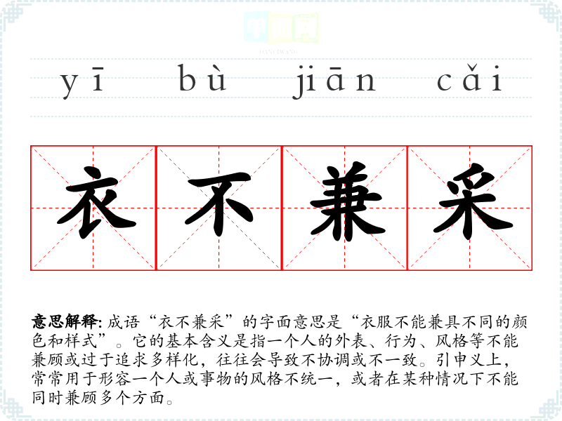 “衣不兼采”让我联想到生活中的一些不协调场景,常常引发一种微妙的不适感。比如,当看到一个人在重要场合穿着不合适的服装时,内心会感到一丝尴尬和不安。这个成语提醒我在表达和形象上要保持一致性。
