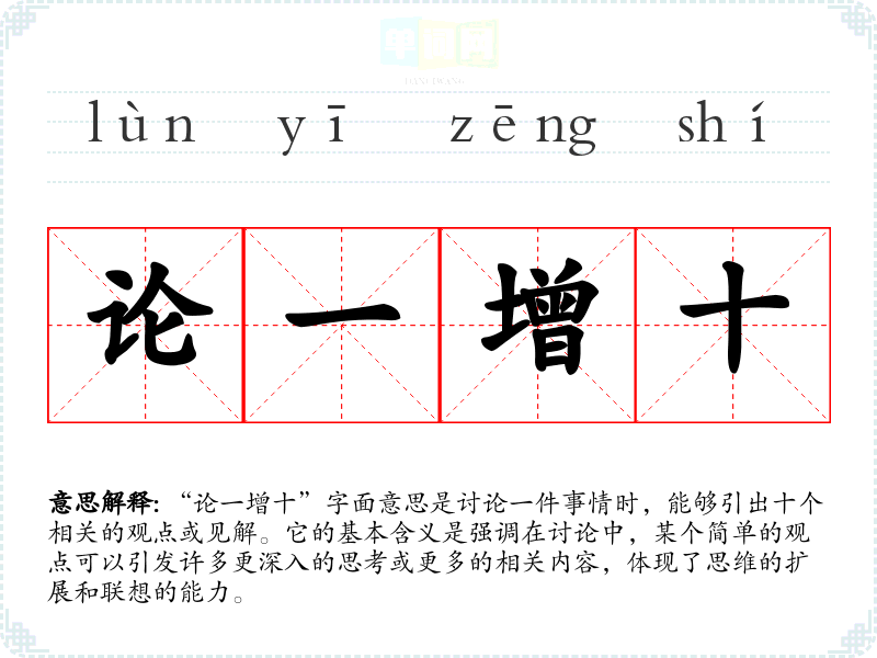 “论一增十”字面意思是讨论一件事情时,能够引出十个相关的观点或见解。它的基本含义是强调在讨论中,某个简单的观点可以引发许多更深入的思考或更多的相关内容,体现了思维的扩展和联想的能力。
