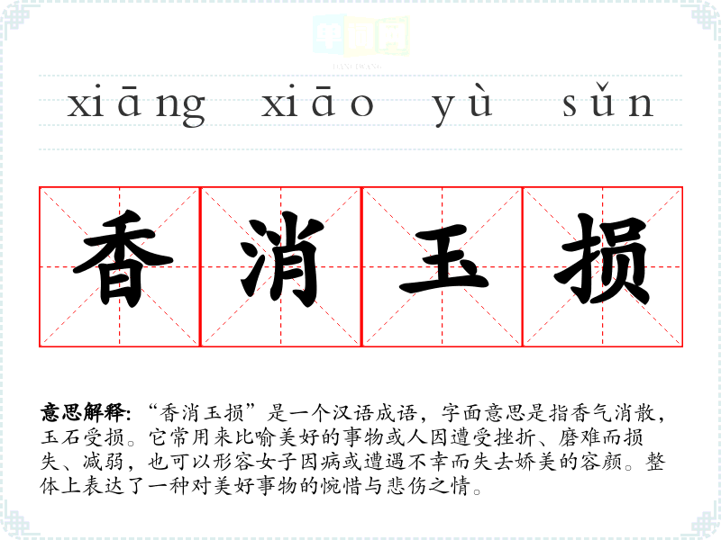 “香消玉损”是一个汉语成语,字面意思是指香气消散,玉石受损。它常用来比喻美好的事物或人因遭受挫折、磨难而损失、减弱,也可以形容女子因病或遭遇不幸而失去娇美的容颜。整体上表达了一种对美好事物的惋惜与悲伤之情。