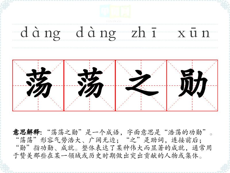 “荡荡之勋”是一个成语,字面意思是“浩荡的功勋”。“荡荡”形容气势浩大、广阔无边;“之”是助词,连接前后;“勋”指功勋、成就。整体表达了某种伟大而显著的成就,通常用于赞美那些在某一领域或历史时期做出突出贡献的人物或集体。