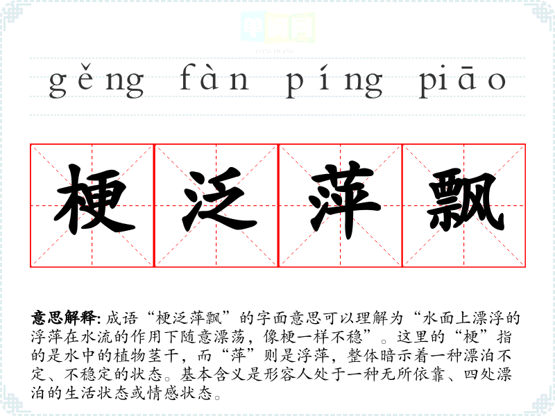 - 文学作品:在描写人物的漂泊与无助时,可以用来形容角色的生活状态。例如,诗人可以描写一个失去方向的人生,以“梗泛萍飘”来形容其无依无靠的心境。