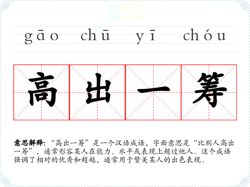 “高出一筹”是一个汉语成语,字面意思是“比别人高出一筹”,通常形容某人在能力、水平或表现上超过他人。这个成语强调了相对的优秀和超越,通常用于赞美某人的出色表现。