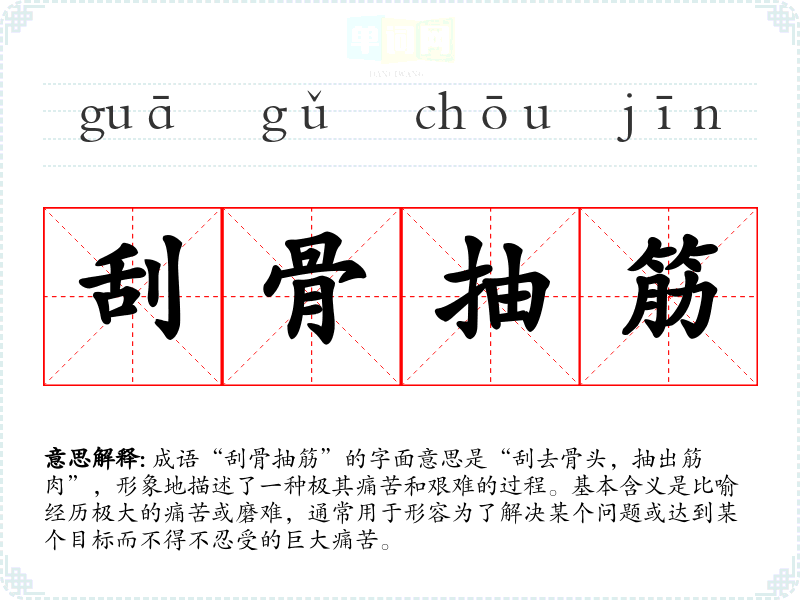 成语“刮骨抽筋”的字面意思是“刮去骨头,抽出筋肉”,形象地描述了一种极其痛苦和艰难的过程。基本含义是比喻经历极大的痛苦或磨难,通常用于形容为了解决某个问题或达到某个目标而不得不忍受的巨大痛苦。