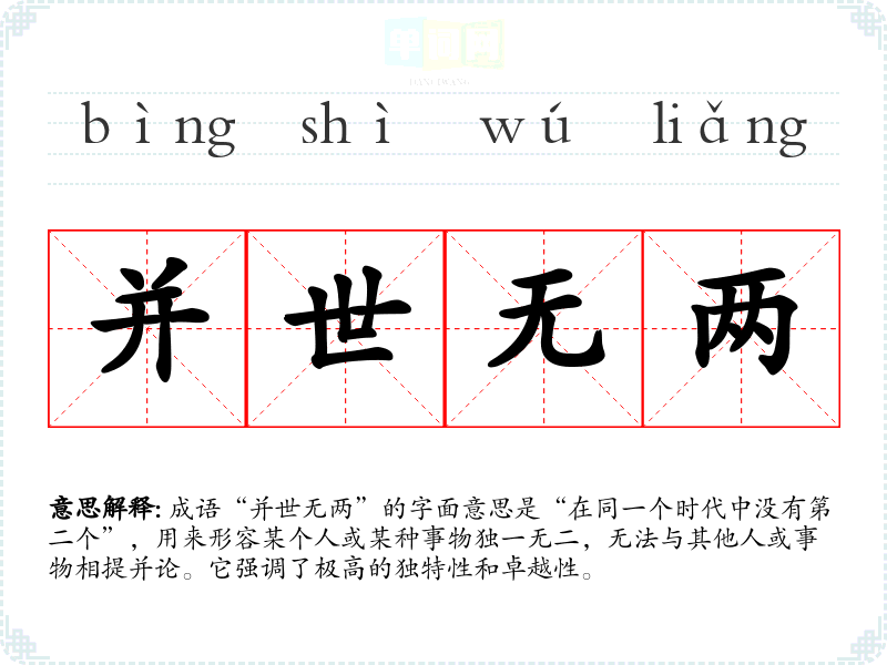 成语“并世无两”的字面意思是“在同一个时代中没有第二个”,用来形容某个人或某种事物独一无二,无法与其他人或事物相提并论。它强调了极高的独特性和卓越性。