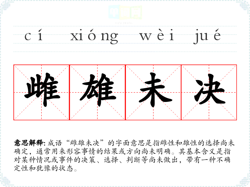 成语“雌雄未决”的字面意思是指雌性和雄性的选择尚未确定,通常用来形容事情的结果或方向尚未明确。其基本含义是指对某种情况或**的决策、选择、判断等尚未做出,带有一种不确定性和犹豫的状态。