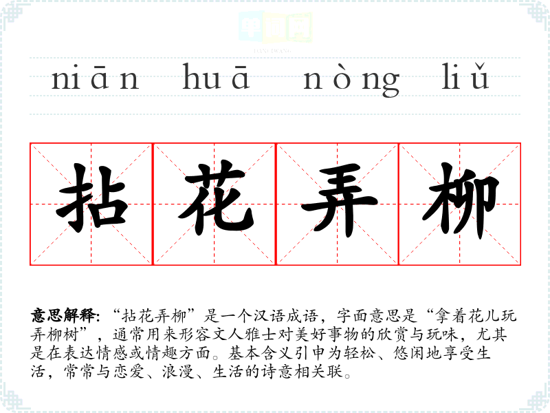 “拈花弄柳”是一个汉语成语,字面意思是“拿着花儿玩弄柳树”,通常用来形容文人雅士对美好事物的欣赏与玩味,尤其是在表达情感或情趣方面。基本含义引申为轻松、悠闲地享受生活,常常与恋爱、浪漫、生活的诗意相关联。