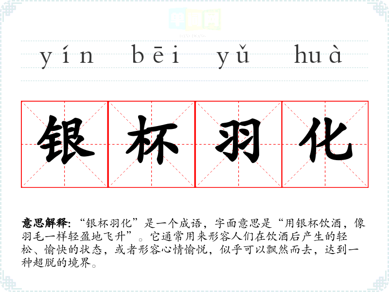 “银杯羽化”是一个成语,字面意思是“用银杯饮酒,像羽毛一样轻盈地飞升”。它通常用来形容人们在饮酒后产生的轻松、愉快的状态,或者形容心情愉悦,似乎可以飘然而去,达到一种超脱的境界。