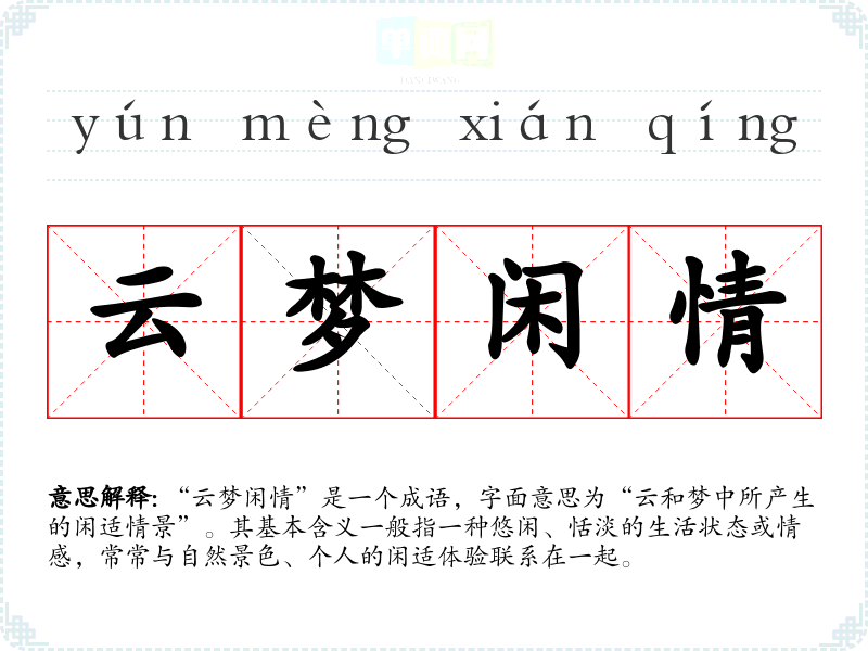 “云梦闲情”带给我一种轻松、宁静的感受。它让我联想到在大自然中悠闲散步的画面,心灵的放松与愉悦。这个成语的使用可以帮助我表达对闲适生活的向往。