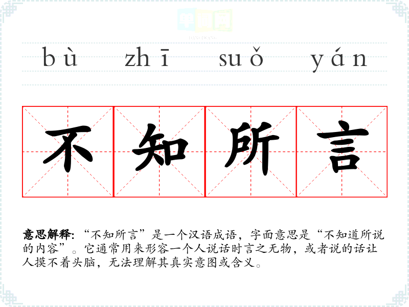 “不知所言”是一个汉语成语,字面意思是“不知道所说的内容”。它通常用来形容一个人说话时言之无物,或者说的话让人摸不着头脑,无法理解其真实意图或含义。