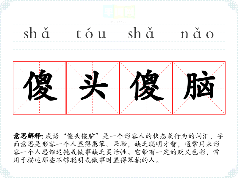 成语“傻头傻脑”是一个形容人的状态或行为的词汇,字面意思是形容一个人显得愚笨、呆滞,缺乏聪明才智,通常用来形容一个人思维迟钝或做事缺乏灵活性。它带有一定的贬义色彩,常用于描述那些不够聪明或做事时显得笨拙的人。