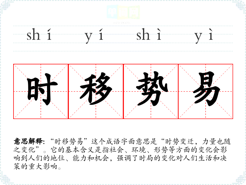 “时移势易”这个成语字面意思是“时势变迁,力量也随之变化”。它的基本含义是指社会、环境、形势等方面的变化会影响到人们的地位、能力和机会,强调了时局的变化对人们生活和决策的重大影响。