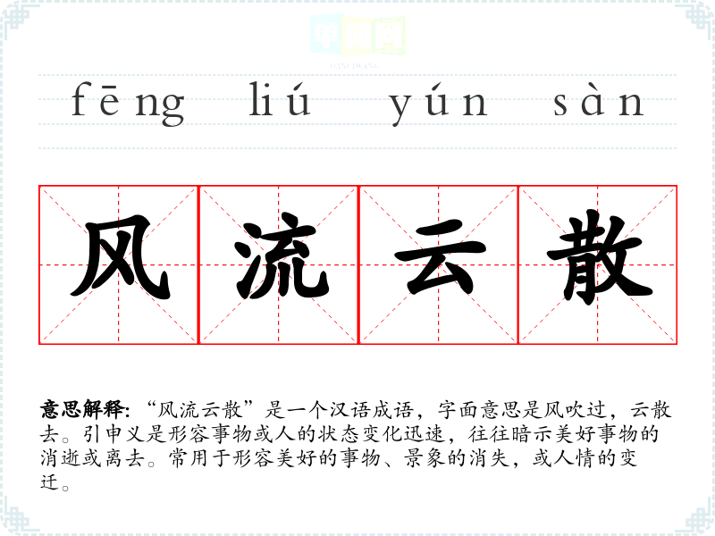 “风流云散”带给人一种淡淡的忧伤和感慨,常常让人联想到过往的美好与遗憾。它能够引发对人生无常的思考,提醒人们珍惜当下的每一刻。