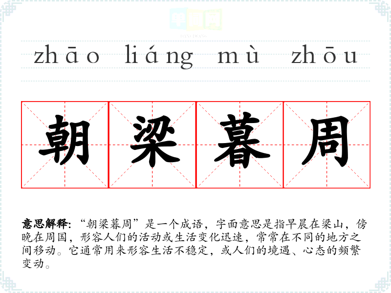“朝梁暮周”是一个成语,字面意思是指早晨在梁山,傍晚在周国,形容人们的活动或生活变化迅速,常常在不同的地方之间移动。它通常用来形容生活不稳定,或人们的境遇、心态的频繁变动。