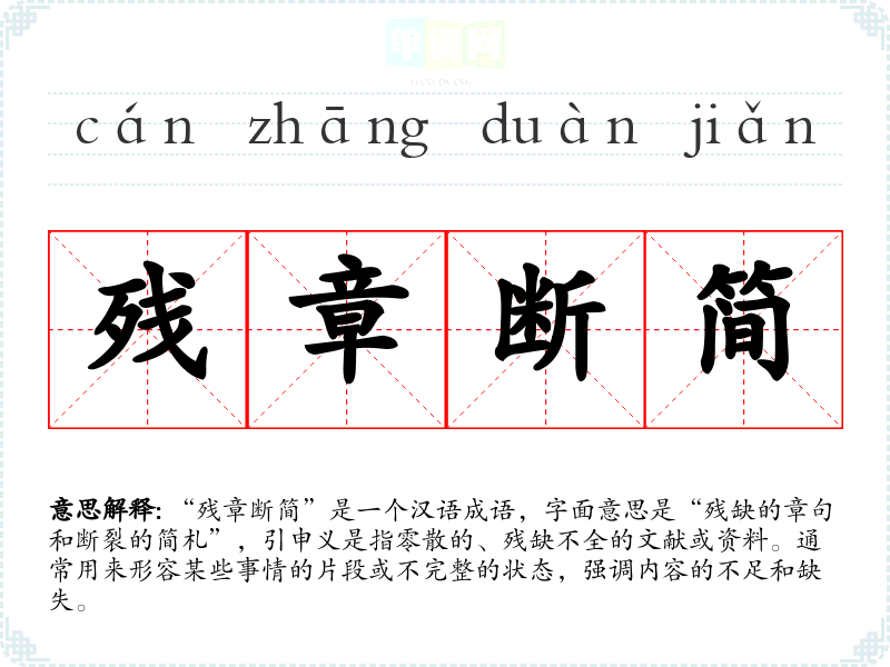 “残章断简”是一个汉语成语,字面意思是“残缺的章句和断裂的简札”,引申义是指零散的、残缺不全的文献或资料。通常用来形容某些事情的片段或不完整的状态,强调内容的不足和缺失。