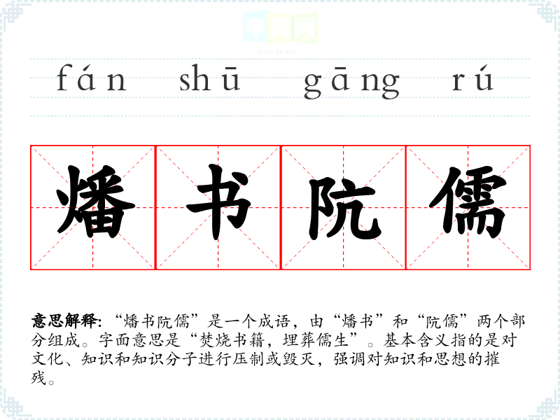 “燔书阬儒”是一个成语,由“燔书”和“阬儒”两个部分组成。字面意思是“焚烧书籍,埋葬儒生”。基本含义指的是对文化、知识和知识分子进行压制或毁灭,强调对知识和思想的摧残。