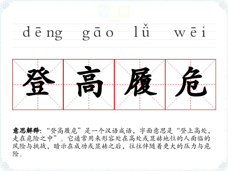 “登高履危”是一个汉语成语,字面意思是“登上高处,走在危险之中”。它通常用来形容处在高处或显赫地位的人面临的风险与挑战,暗示在成功或显赫之后,往往伴随着更大的压力与危险。