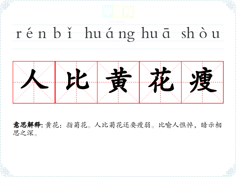 | 人比黄花瘦 | 黄花:指菊花。人比菊花还要瘦弱。比喻人憔悴,暗示相思之深。 |