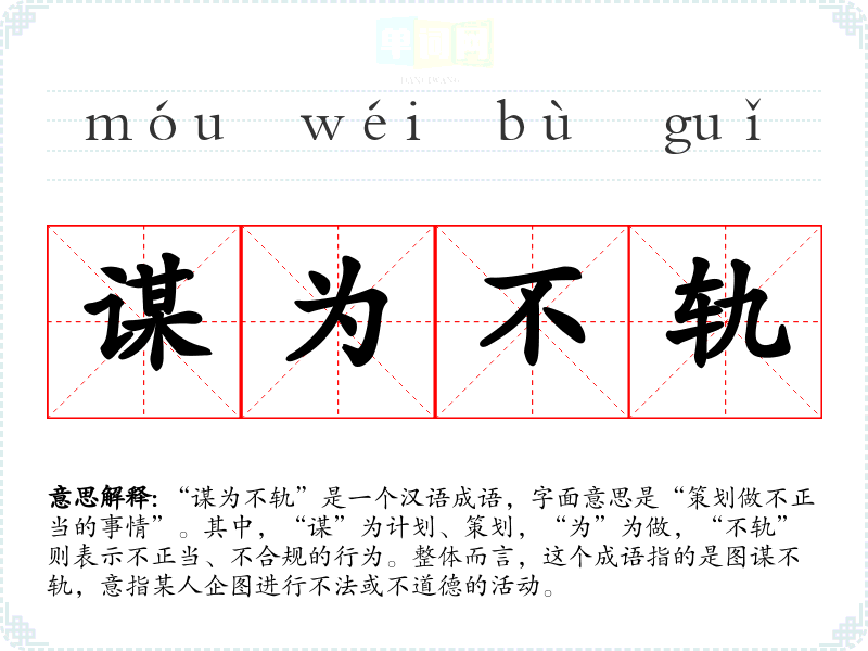 “谋为不轨”是一个汉语成语,字面意思是“策划做不正当的事情”。其中,“谋”为计划、策划,“为”为做,“不轨”则表示不正当、不合规的行为。整体而言,这个成语指的是图谋不轨,意指某人企图进行不法或不道德的活动。