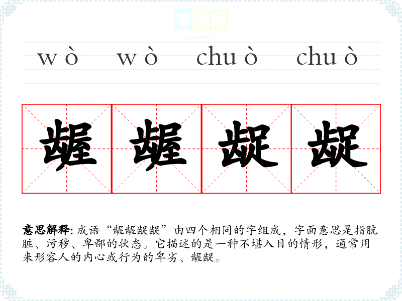 成语“龌龌龊龊”由四个相同的字组成,字面意思是指肮脏、污秽、卑鄙的状态。它描述的是一种不堪入目的情形,通常用来形容人的内心或行为的卑劣、龌龊。