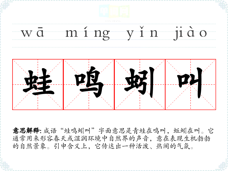 成语“蛙鸣蚓叫”字面意思是青蛙在鸣叫,蚯蚓在叫。它通常用来形容春天或湿润环境中自然界的声音,意在表现生机勃勃的自然景象。引申含义上,它传达出一种活泼、热闹的气氛。