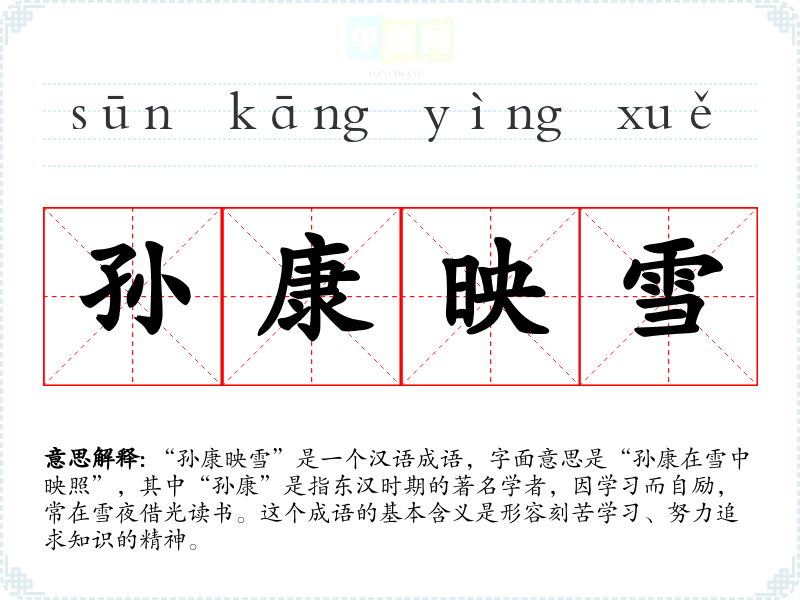 “孙康映雪”是一个汉语成语,字面意思是“孙康在雪中映照”,其中“孙康”是指东汉时期的著名学者,因学而自励,常在雪夜借光读书。这个成语的基本含义是形容刻苦学、努力追求知识的精神。