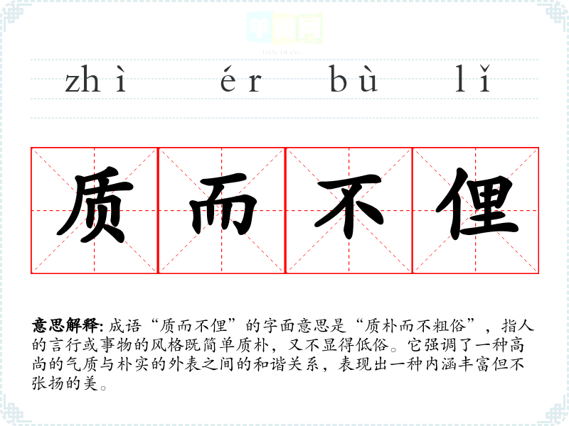 成语“质而不俚”的字面意思是“质朴而不粗俗”,指人的言行或事物的风格既简单质朴,又不显得低俗。它强调了一种高尚的气质与朴实的外表之间的和谐关系,表现出一种内涵丰富但不张扬的美。