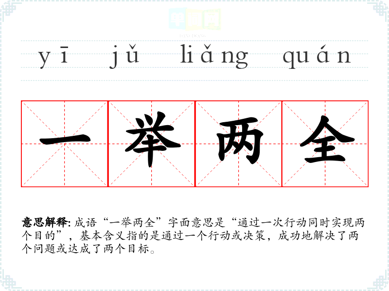 成语“一举两全”字面意思是“通过一次行动同时实现两个目的”,基本含义指的是通过一个行动或决策,成功地解决了两个问题或达成了两个目标。