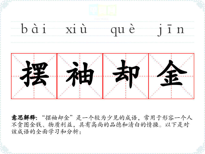 “摆袖却金”是一个较为少见的成语,常用于形容一个人不贪图金钱、物质利益,具有高尚的品德和清白的情操。以下是对该成语的全面学*和分析: