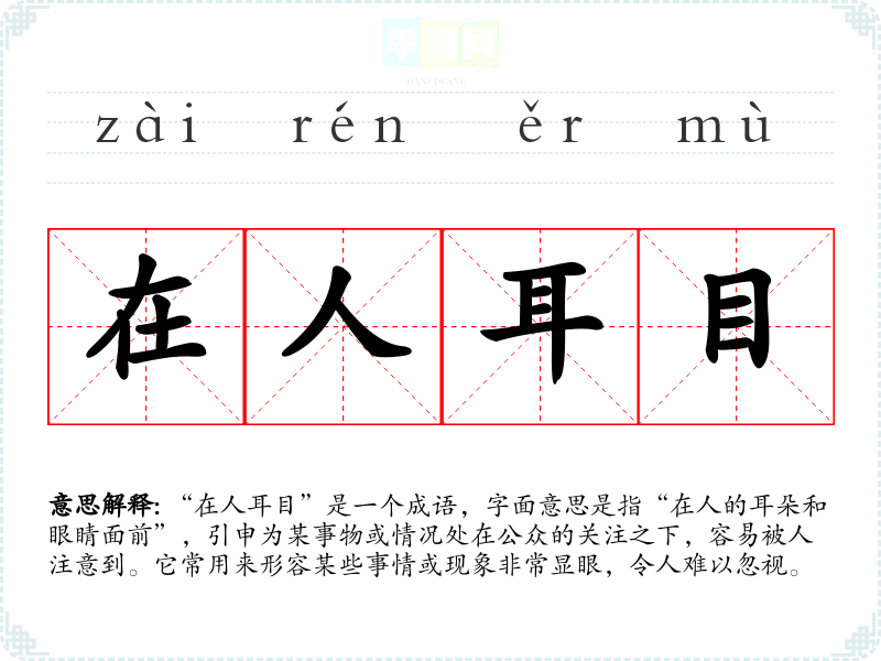 “在人耳目”这一成语的具体来源并不十分明确,可能与古代文献中对“耳目”二字的使用有关。耳目常指听觉和视觉,强调感知的能力。在传统文化中,耳目也常与信息的获取和传播相关。