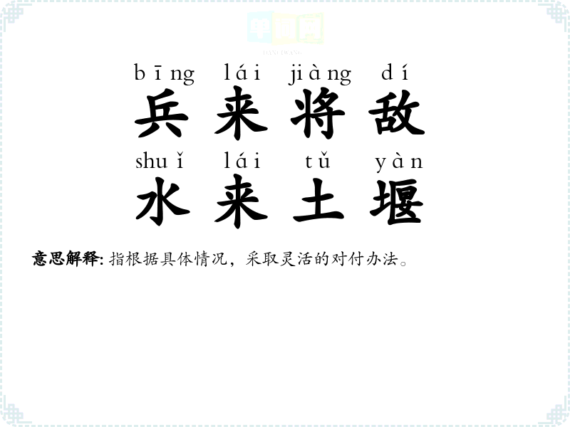 | 兵来将迎,水来土堰 | 指根据具体情况,采取灵活的对付办法。 |