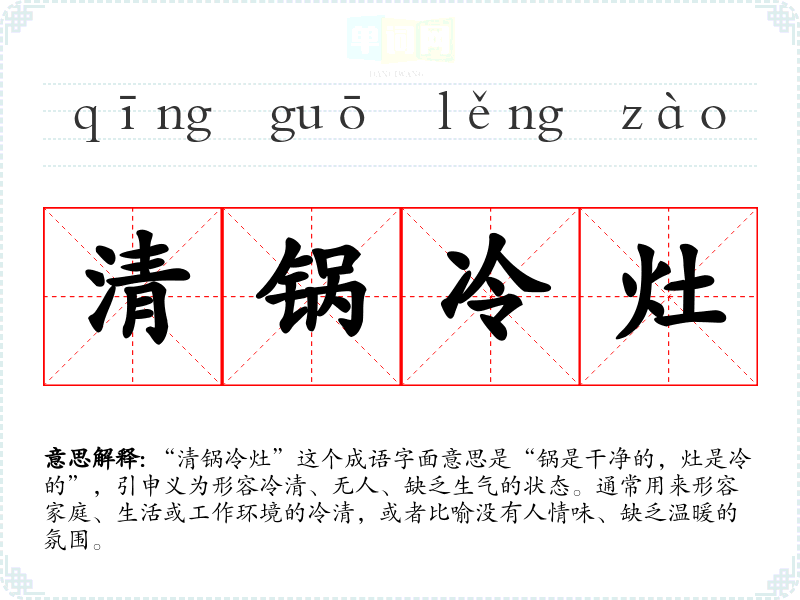 “清锅冷灶”这个成语字面意思是“锅是干净的,灶是冷的”,引申义为形容冷清、无人、缺乏生气的状态。通常用来形容家庭、生活或工作环境的冷清,或者比喻没有人情味、缺乏温暖的氛围。