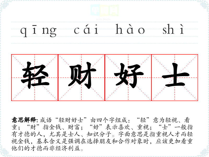 成语“轻财好士”由四个字组成:“轻”意为轻视、看重;“财”指金钱、财富;“好”表示喜欢、重视;“士”一般指有才德的人,尤其是士人、知识分子。字面意思是指重视人才而轻视金钱,基本含义是强调在选择朋友和合作对象时,应该更加看重他们的才德而非经济利益。