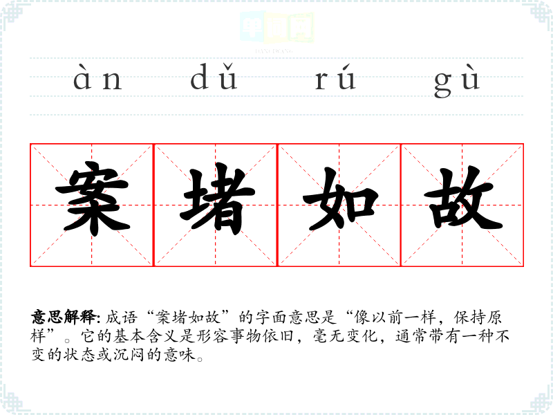 成语“案堵如故”的字面意思是“像以前一样,保持原样”。它的基本含义是形容事物依旧,毫无变化,通常带有一种不变的状态或沉闷的意味。