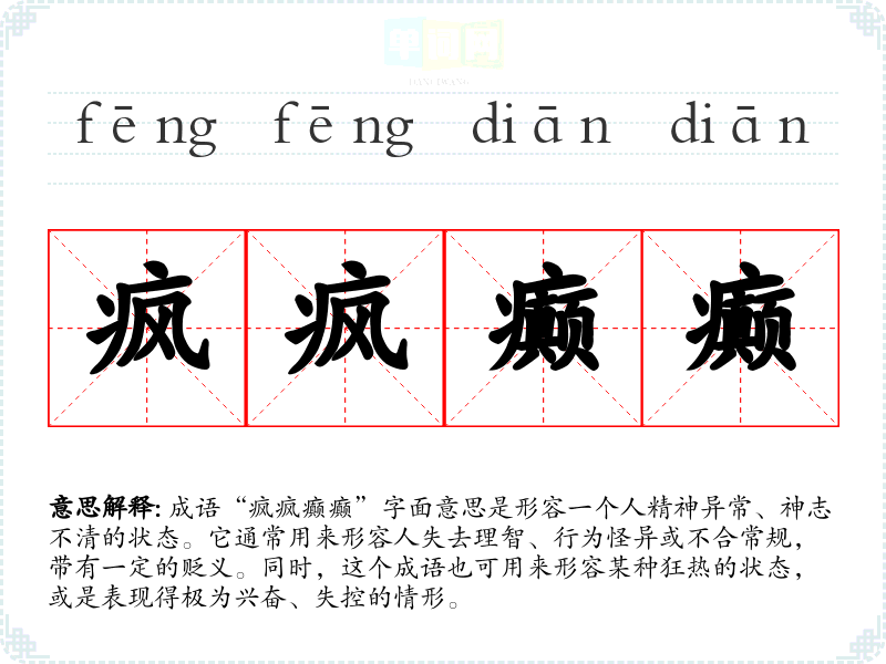 | 疯疯癫癫 | 精神失常的样子。形容人言语行动轻狂或超出常态。 |