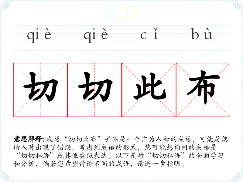 成语“切切此布”并不是一个广为人知的成语,可能是您输入时出现了错误。考虑到成语的形式,您可能想询问的成语是“切切私语”或其他类似表达。以下是对“切切私语”的全面学*和分析,倘若您希望讨论不同的成语,请进一步指明。