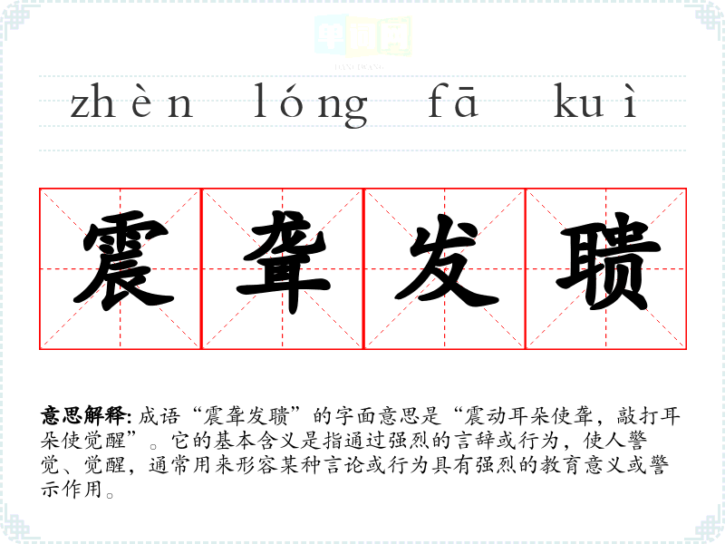 成语“震聋发聩”的字面意思是“震动耳朵使聋,敲打耳朵使觉醒”。它的基本含义是指通过强烈的言辞或行为,使人警觉、觉醒,通常用来形容某种言论或行为具有强烈的教育意义或警示作用。