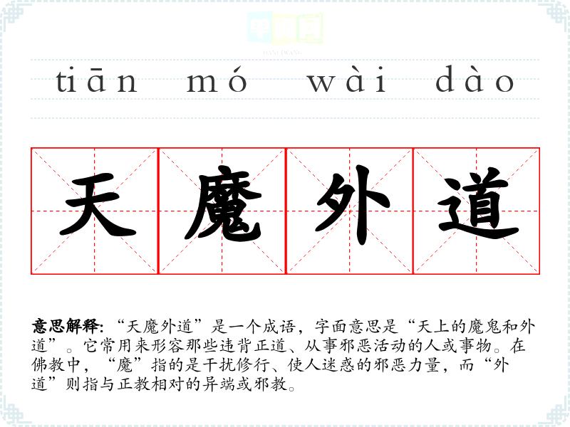 | 天魔外道 | 外道:佛家语,指不合佛法的教度。指正统以外的的异端流派。 |